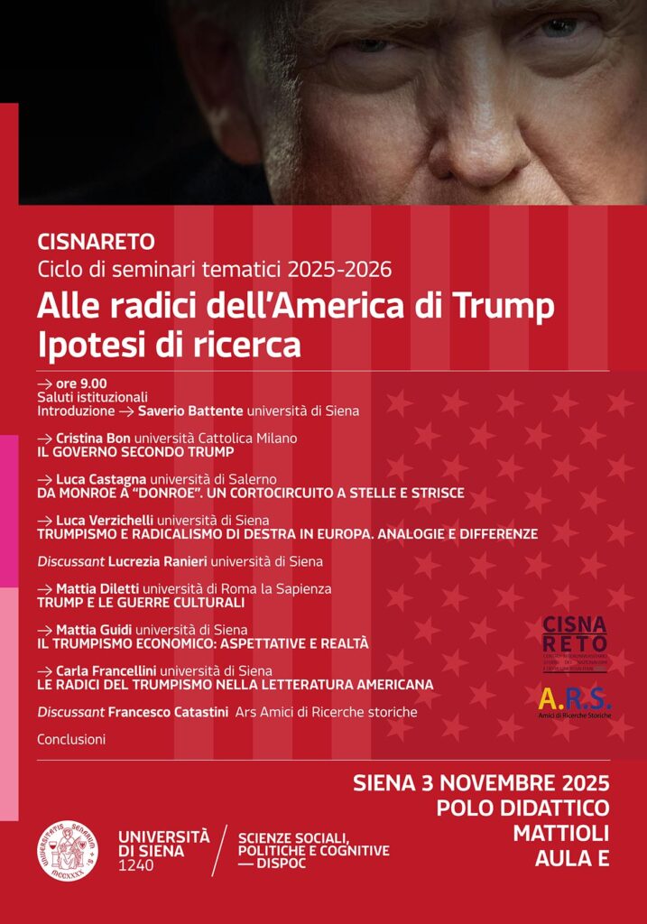 Il 3 novembre 2025, a Siena presso il Polo Didattico Mattioli, Aula E (in via Pier Andrea Mattioli, n. 10) a partire dalle ore 9:00 si terrà il Seminario, Alle radici dell’America di Trump.